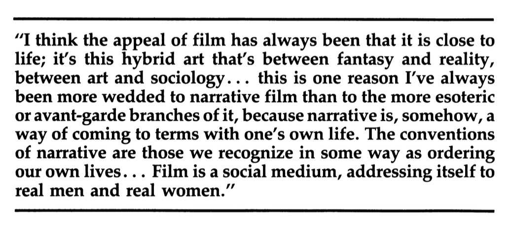 This was quite a heady change from her well-bred southern childhood in Richmond, Virginia, where she was a debutante. I find the dichotomy between her “Southern Belle” (to use her own phrasing) upbringing and her New York cinema-saturated adulthood fascinating—one about propriety, decorum, and tradition, the other revolving around curiosity, openness, and multiculturalism. How she went from a rather repressive society—with a very narrow understanding of women’s possibilities in life—to a world of revival screenings, film festivals, and deep philosophical conversations about cinema as art… Now, that is a story. In her books, Molly drops little nuggets about her upbringing and background—tantalizing crumbs amidst discussions of Barbara Stanwyck or Joan Crawford.