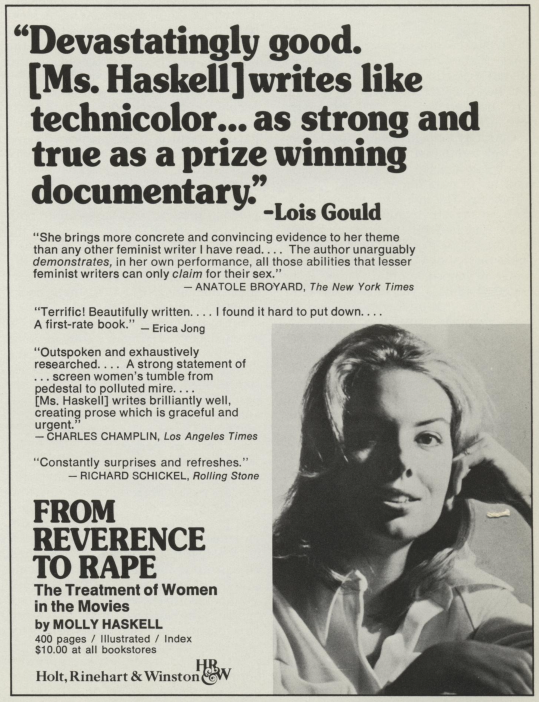 In 1969, Haskell joined The Village Voice, first as a theater critic, then as a movie reviewer; and after their marriage, she went on to write in the 1970s and 1980s for New York Magazine, Vogue, Ms., and Viva. I first became aware of Molly’s writing through Viva, where her feminist film criticism fit easily within the heady liberatory politics of the magazine. Additionally, she has written for The New York Times, The Guardian, Esquire, The New York Review of Books, Film Comment, and many other publications.
